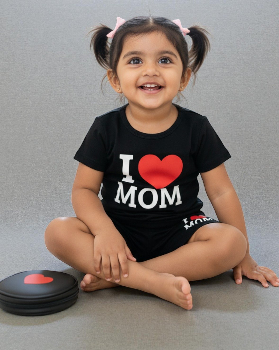This two-piece set features a trendy black T-shirt with a bold “I ❤️ MOM” print and matching nicker-style shorts with the same adorable design. Perfect for summer wear, playdates, family photos, or gifting!
