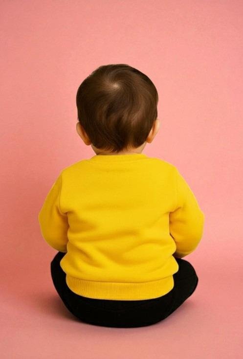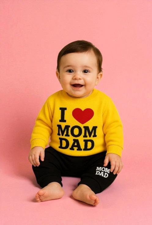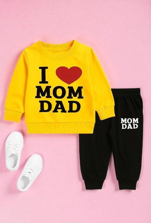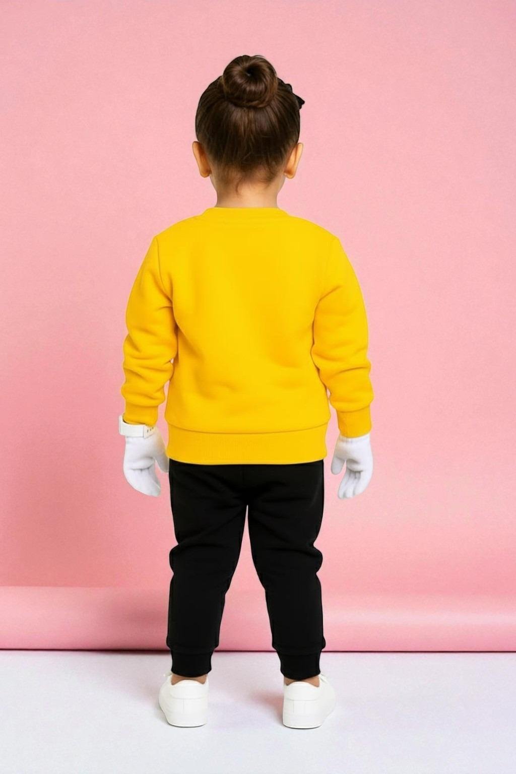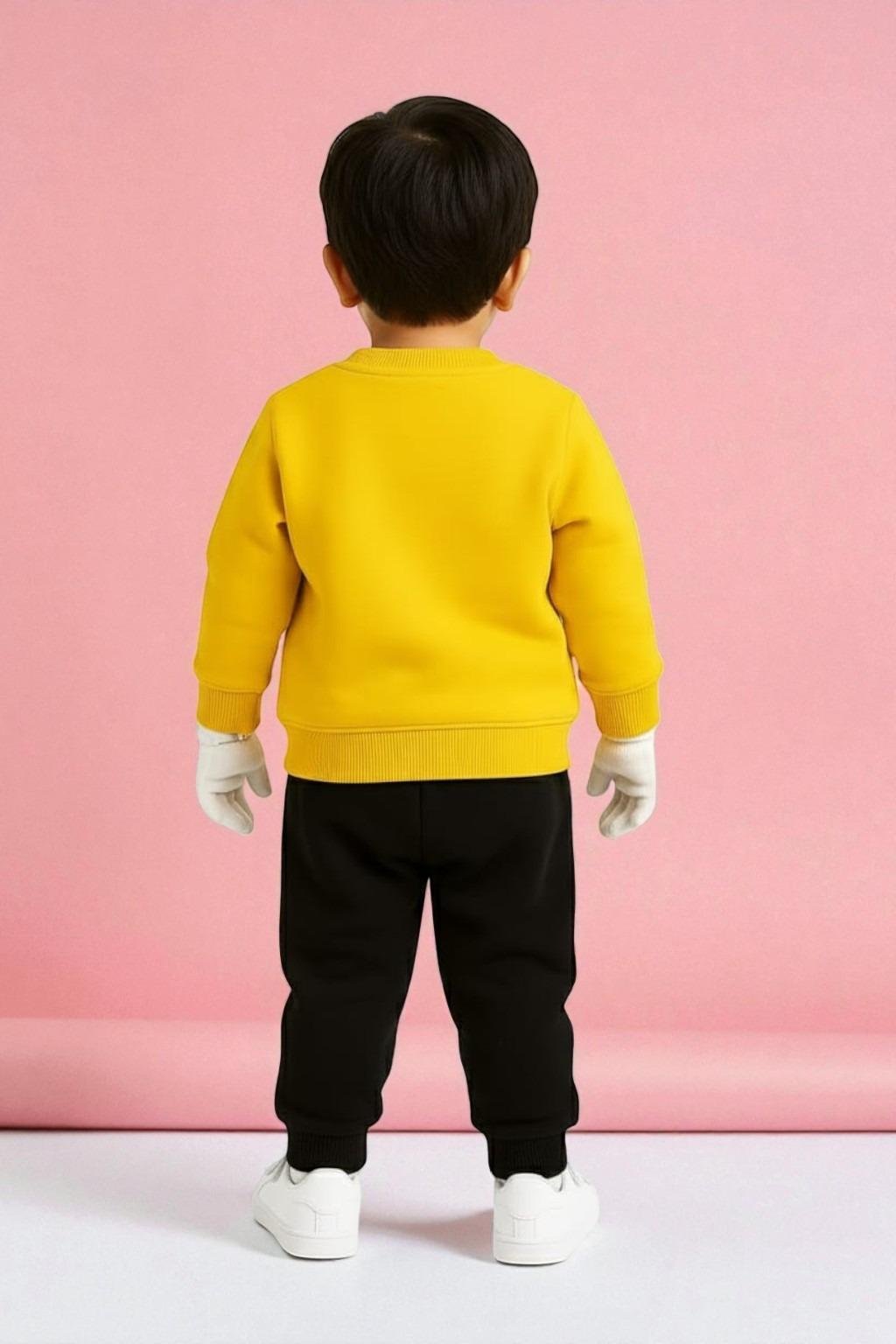 The vibrant mustard sweatshirt features bold “THE BEST RUN QUALITY” text for a fun, sporty look, paired with contrasting black jogger pants that complete the trendy style. The flexible waistband and cuffed ankles ensure a snug, secure fit that lets kids move freely and play all day.