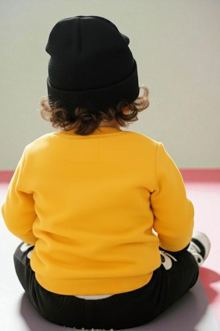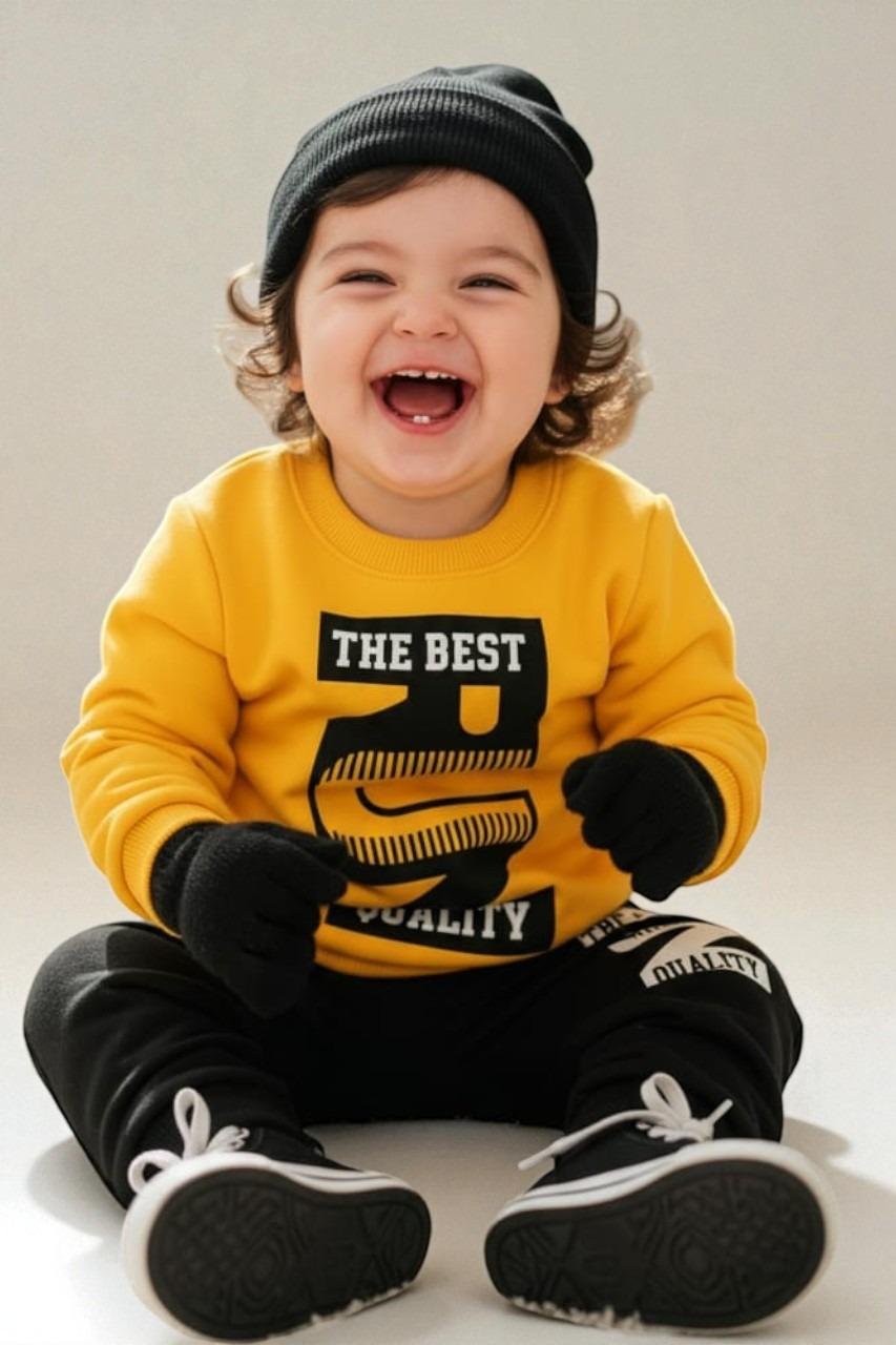 The vibrant mustard sweatshirt features bold “THE BEST RUN QUALITY” text for a fun, sporty look, paired with contrasting black jogger pants that complete the trendy style. The flexible waistband and cuffed ankles ensure a snug, secure fit that lets kids move freely and play all day.