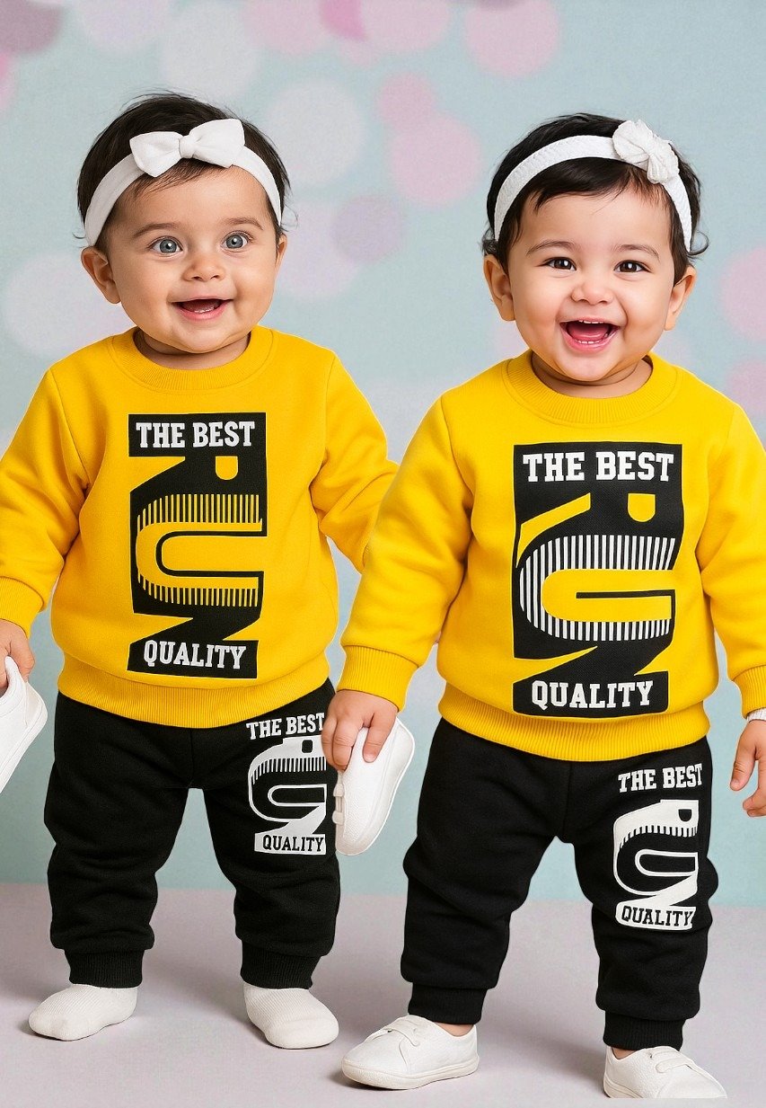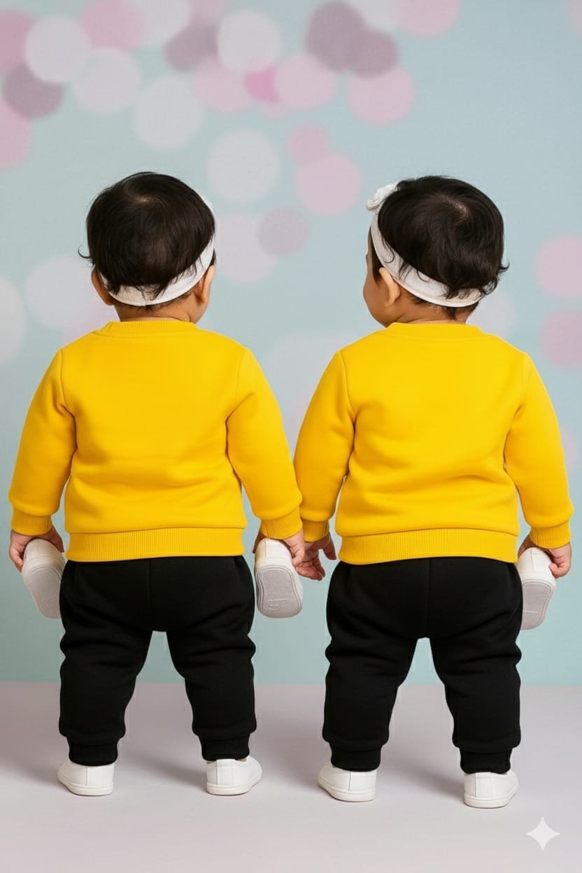 Let your baby run, play, and stay cozy this season with the KicoWear “The Best Run Quality” 2-Piece Fleece Set. Crafted with high-quality fleece 260 GSM, this winter outfit is soft, warm, and gentle on delicate baby skin. The combination of a bright yellow sweatshirt and black joggers gives it a stylish contrast, while the bold “RUN” print adds a sporty charm.
