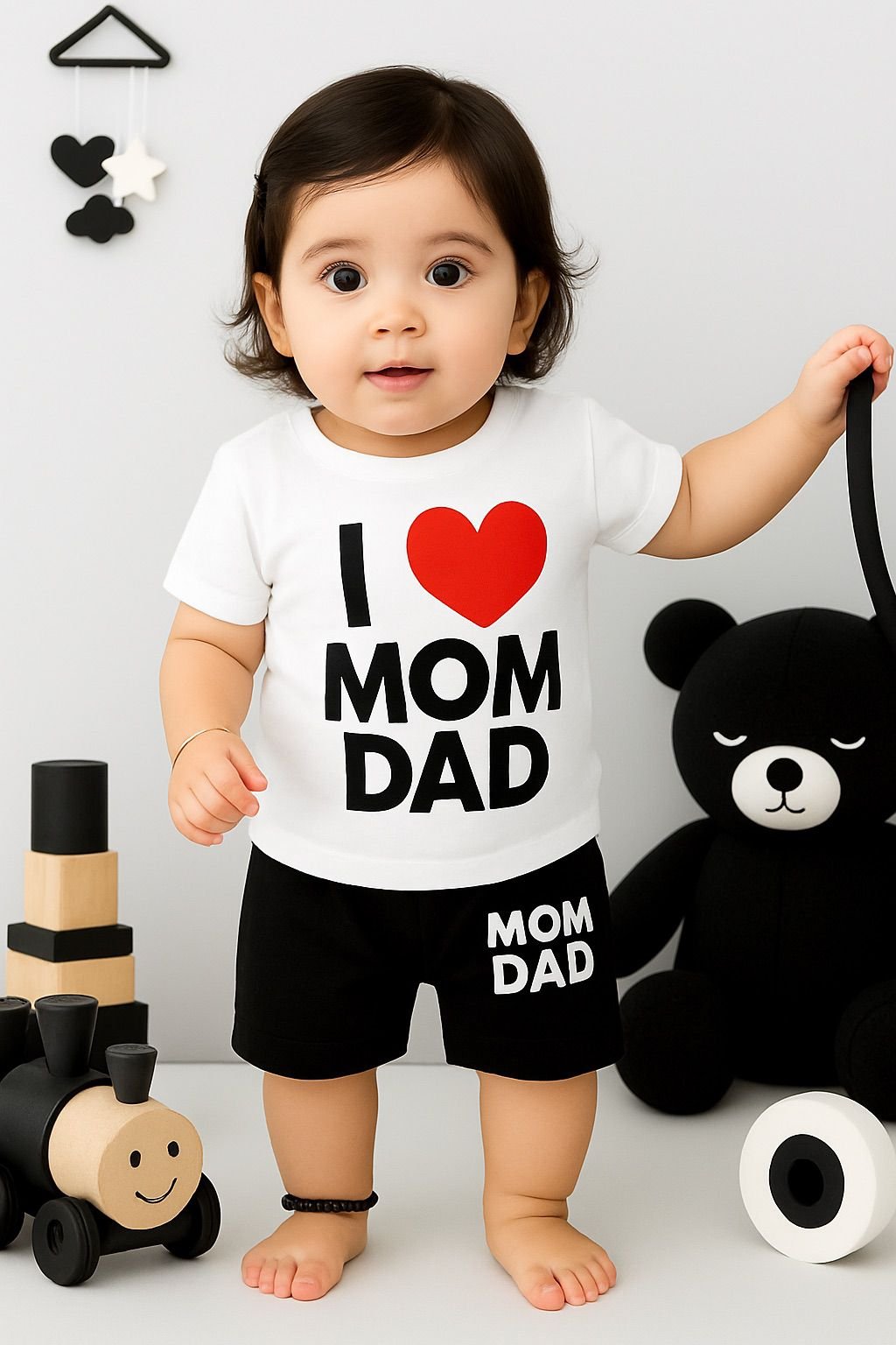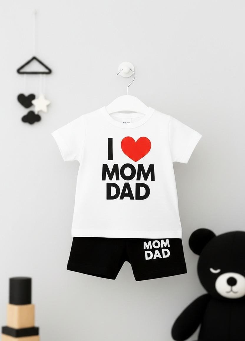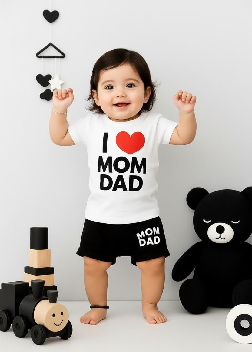 Crafted from high-quality Airzed fabric with 190 GSM thickness, this nicker suit offers a perfect balance of softness, breathability, and durability. The fabric is gentle on delicate skin, ensuring maximum comfort throughout the day. The bold yet cute “I ❤️ Mom Dad” print adds a playful and emotional touch, making it a favorite choice for parents.