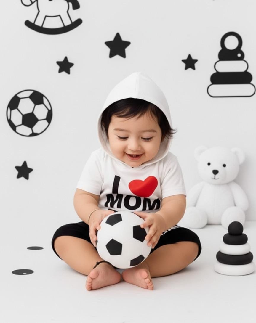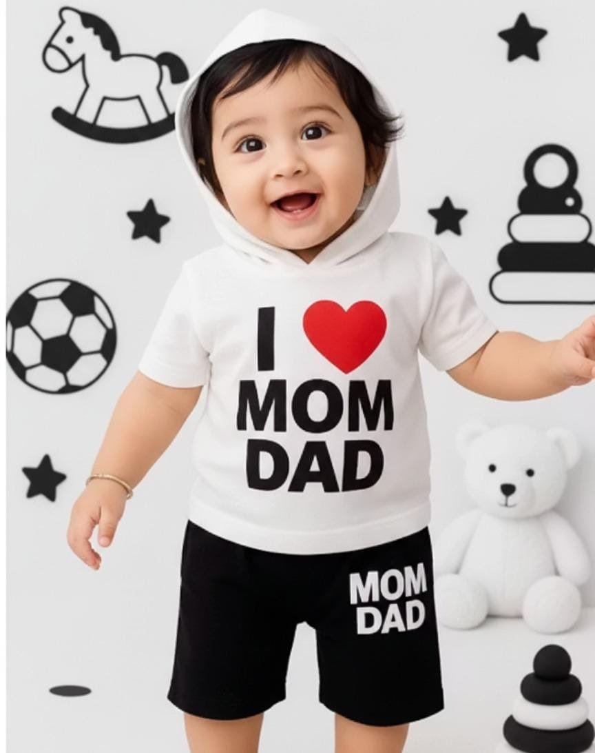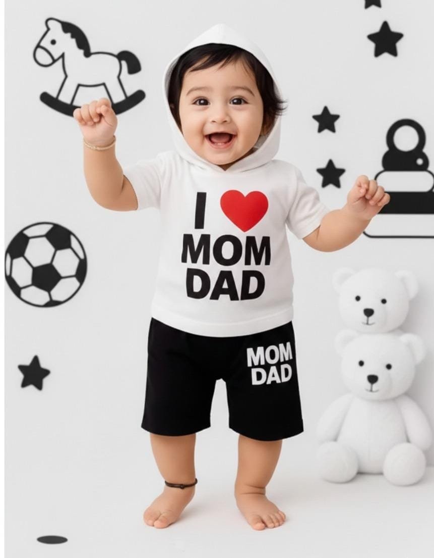 Make your little one shine in love and comfort with the KicoWear Unisex “I Love Mom Dad” White Cap Nicker Suit. This charming outfit is thoughtfully designed for both baby boys and girls, combining style, softness, and practicality.