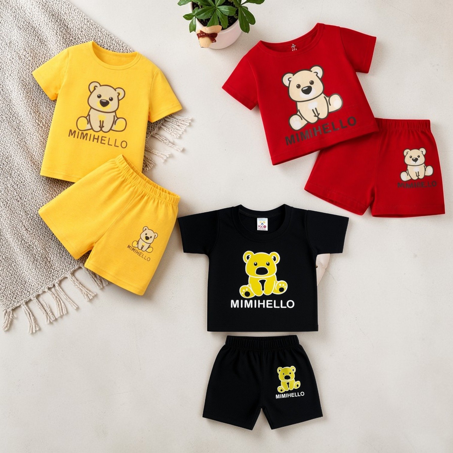 Give your little one a complete style upgrade with the adorable KicoWear Unisex MimiHello Nicker Suit Pack of 3. Designed for babies and growing kids, this combo set includes three stylish outfits in Red, Yellow, and Black, each featuring a cute MimiHello teddy print that adds a playful and charming touch.