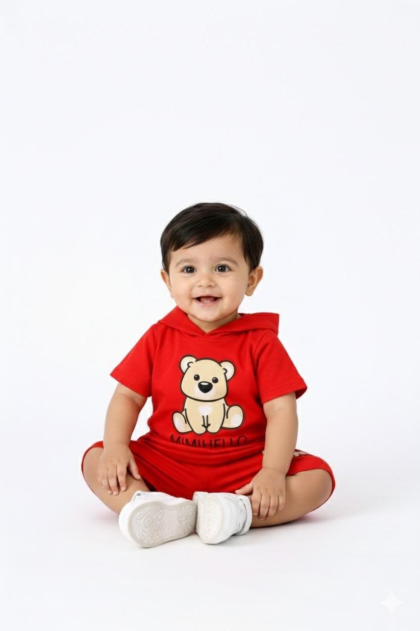 Add bold style and adorable charm to your child’s wardrobe with the KicoWear Unisex Red Mimihello Cap Nicker Suit. Specially designed for babies and growing kids, this outfit features a cute Mimihello teddy print on a vibrant red base, giving your little one a playful, confident, and eye-catching look.