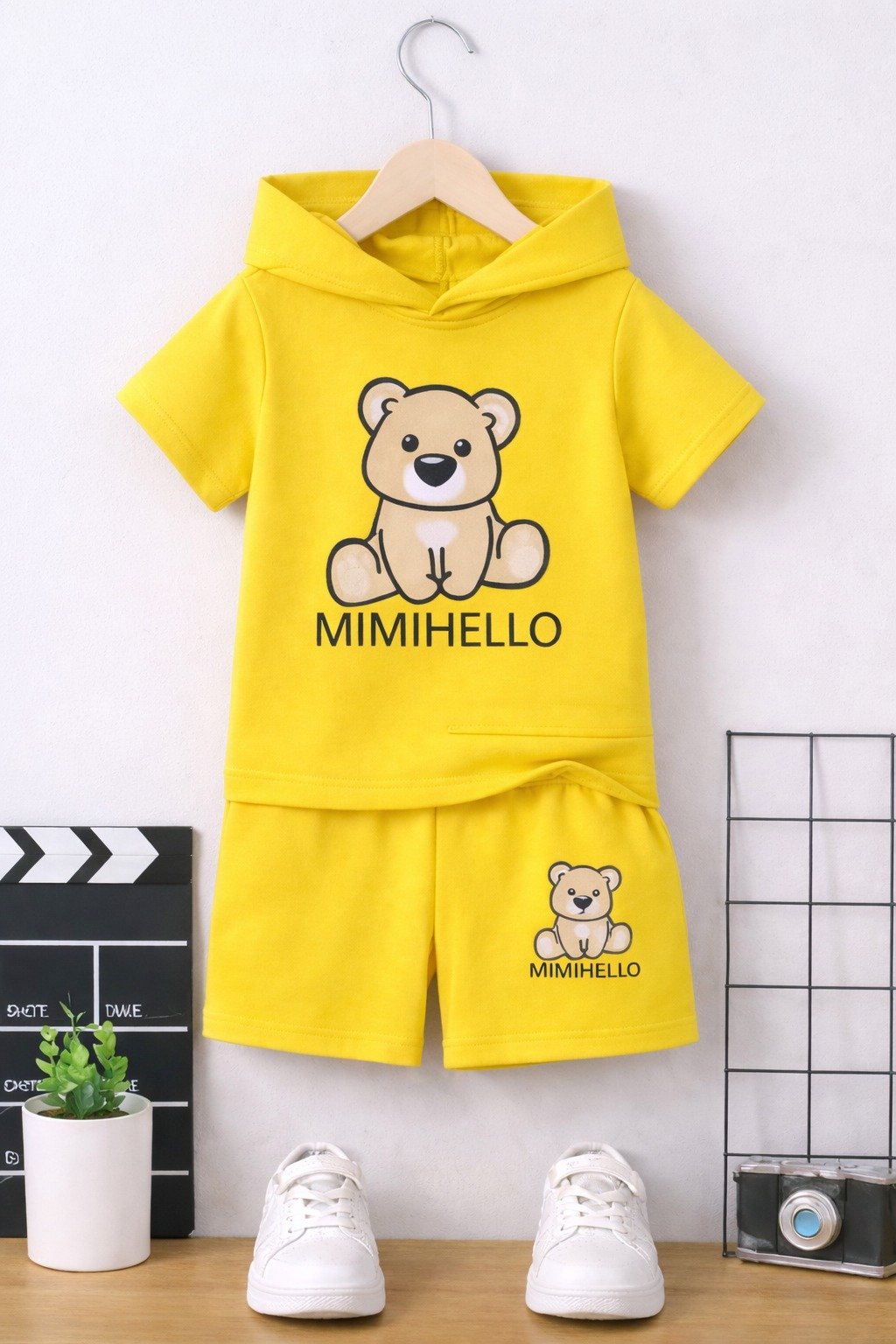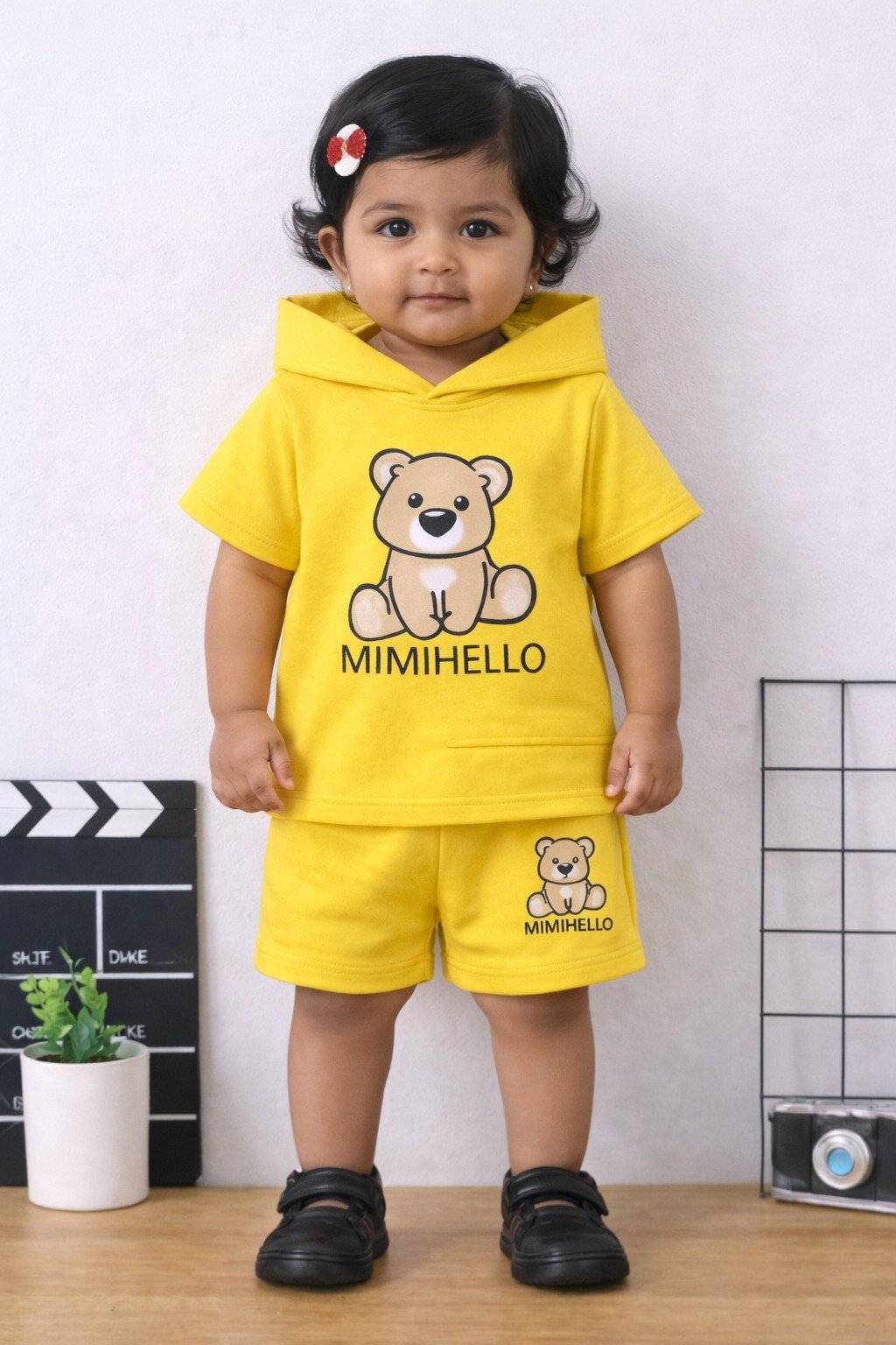 Add a pop of brightness and adorable charm to your child’s wardrobe with the KicoWear Unisex Yellow Mimihello Cap Nicker Suit. Specially designed for babies and growing kids, this outfit features a cute teddy “Mimihello” print on a vibrant yellow base, giving your little one a playful, cheerful, and trendy look.