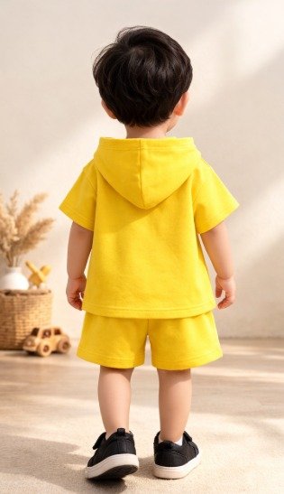 The hooded cap-style t-shirt adds a trendy and stylish touch while also providing a comfortable fit. The matching shorts come with a soft elastic waistband that ensures a secure yet gentle fit without causing discomfort. High-quality stitching and durable fabric ensure that the outfit maintains its shape, color, and softness even after repeated washes.